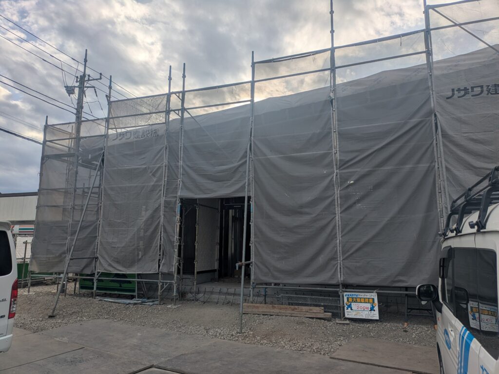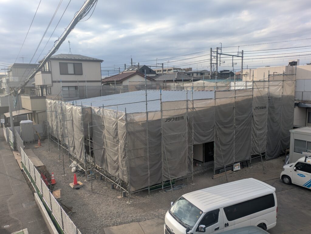 現在は足場が組まれ、グレーの養生シートに包まれていますが、その中では着々と新しい事務所の骨組みが出来上がっています。 近くで見ると、かなりの迫力!所沢の街に新しく馴染んでいく姿を想像すると、私たちスタッフも今から胸が高鳴ります。