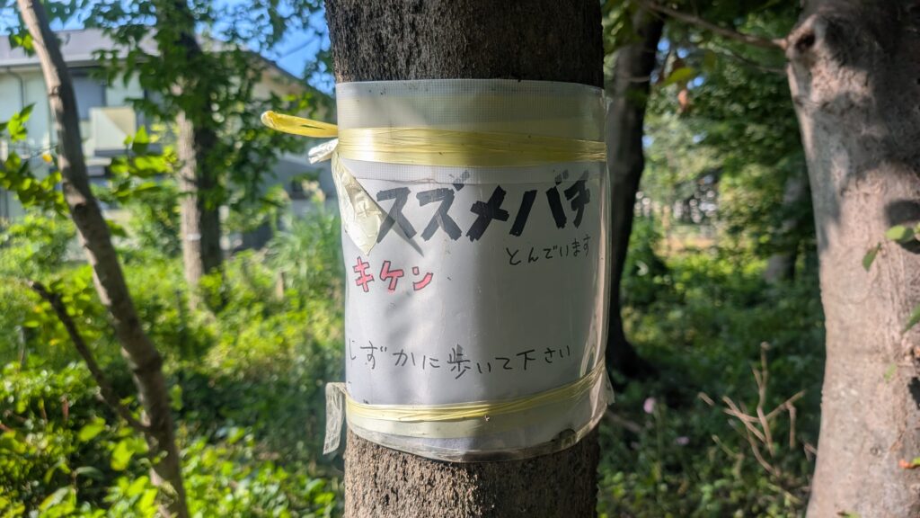森の中を進むといろんなところにスズメバチ注意の貼り紙がしてありました。