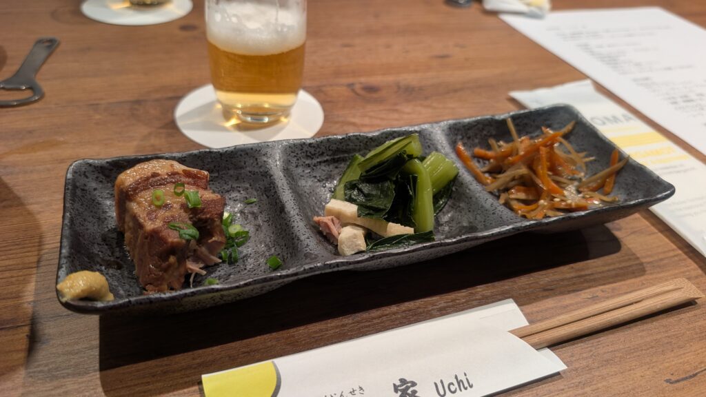 お通し3種盛りの中に角煮が入っていて、気分が高まりますね!
